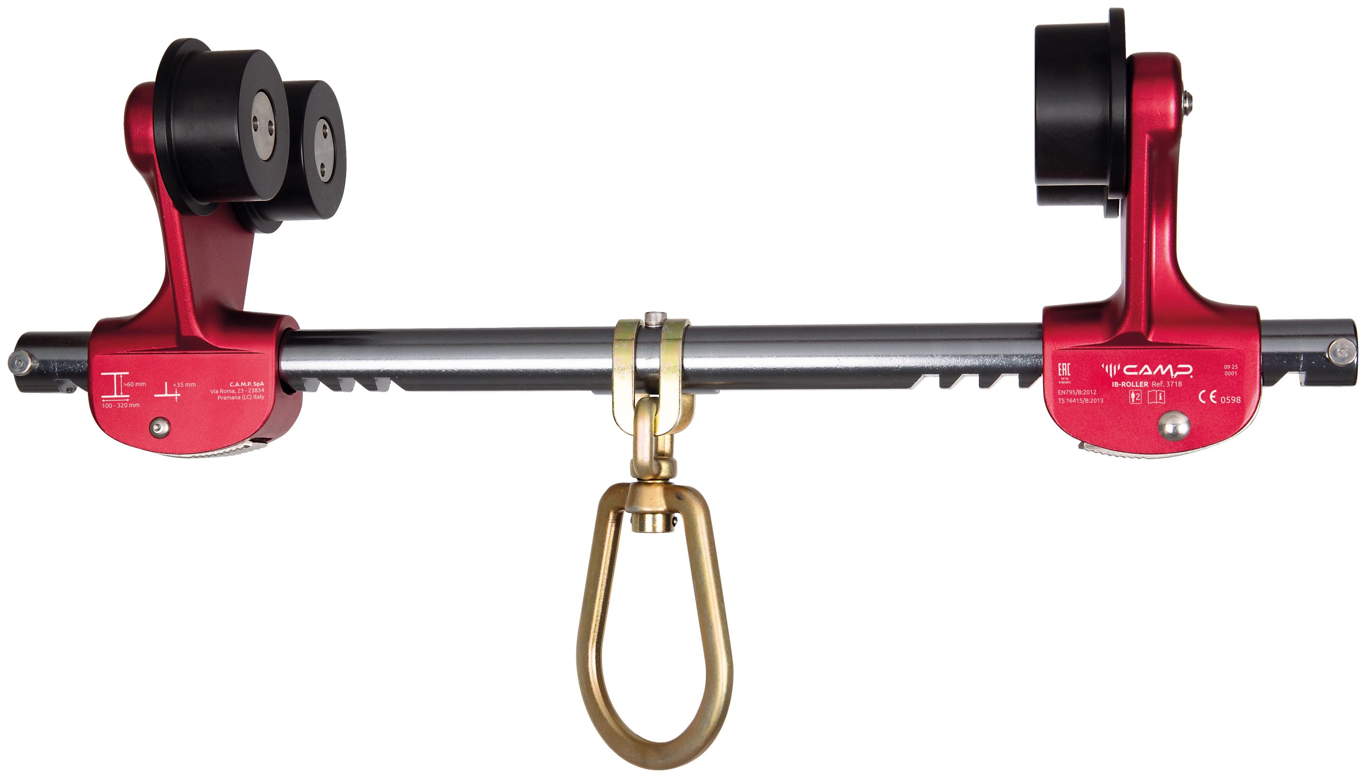 Mobiler Anschlagpunkt für I-Träger aus Metall mit einer Breite zwischen 105 und 320 mm. Einfache und intuitive Breitenverstellung über doppelten Druckknopf. Reibungslose Bewegung dank Rollen aus thermoplastischem Material.