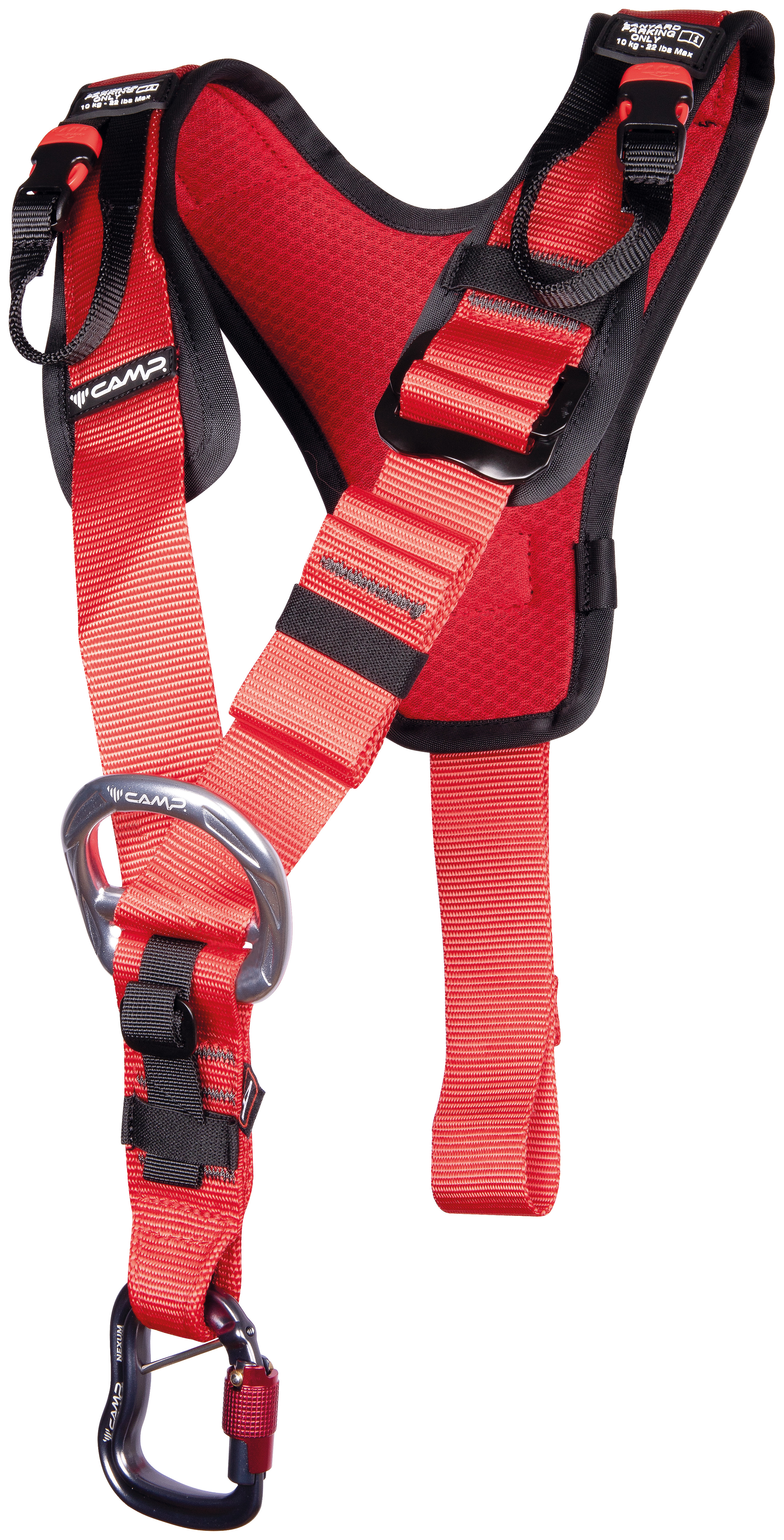 Brustgurt mit 2 Einhängeösen: 1 auf Brusthöhe, 1 am Rücken. Die Polsterform wurde für einen optimalen Komfort, insbesondere am Hals, konzipiert. Doppelte Höheneinstellung (vorne und hinten).