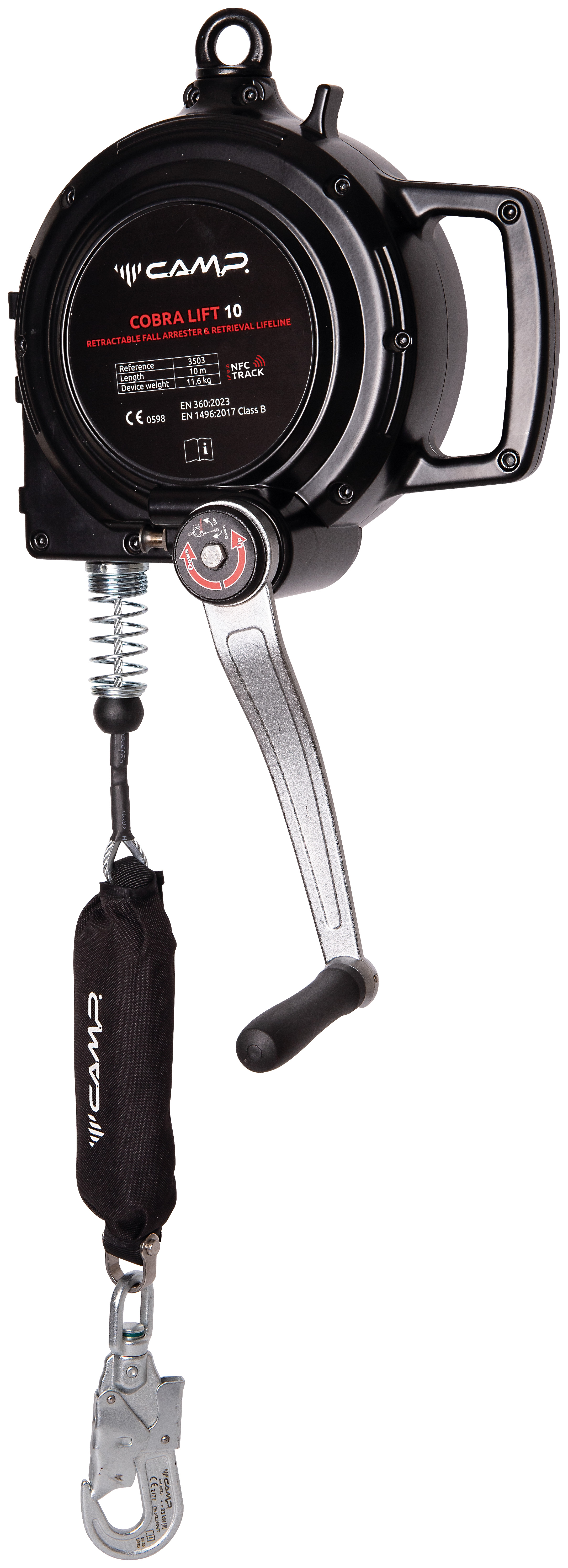 Höhensicherungsgerät mit Kurbelhubmechanismus. Die Bergungswinde kann als normales Höhensicherungsgerät verwendet werden und lässt sich leicht aktivieren, um den Benutzer nach einem Unfall sicher zu retten