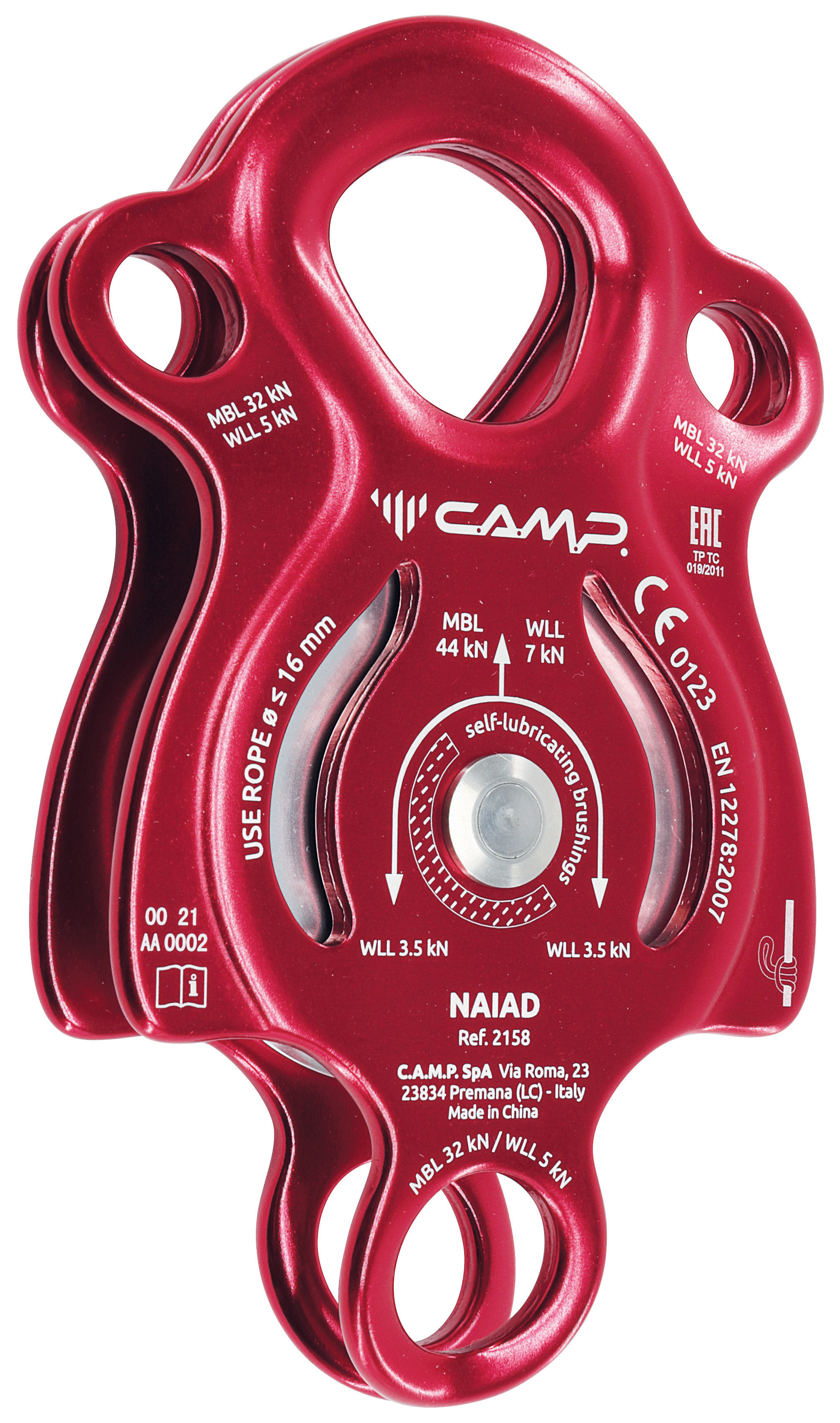 Hochfeste multifunktionale Seilrolle. Für die Bildung von Flaschenzügen und komplexe Manöver. Rad mit großem Durchmesser. Haupteinhängeöffnung für drei Karabiner, zwei Zweitöffnungen seitlich und eine untere in Übergröße