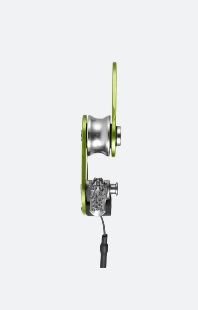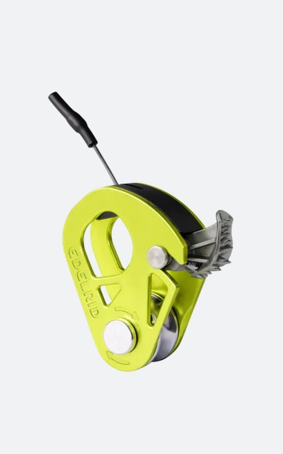 Ultraleichte Umlenkrolle mit Rücklaufsperre. Konzipiert zum Heben von Lasten, zur Spaltenbergung oder als Notfallseilklemme. Die Rücklaufsperre kann in geöffneter Position fixiert werden, um das Gerät als einfache Umlenkrolle zu nutzen