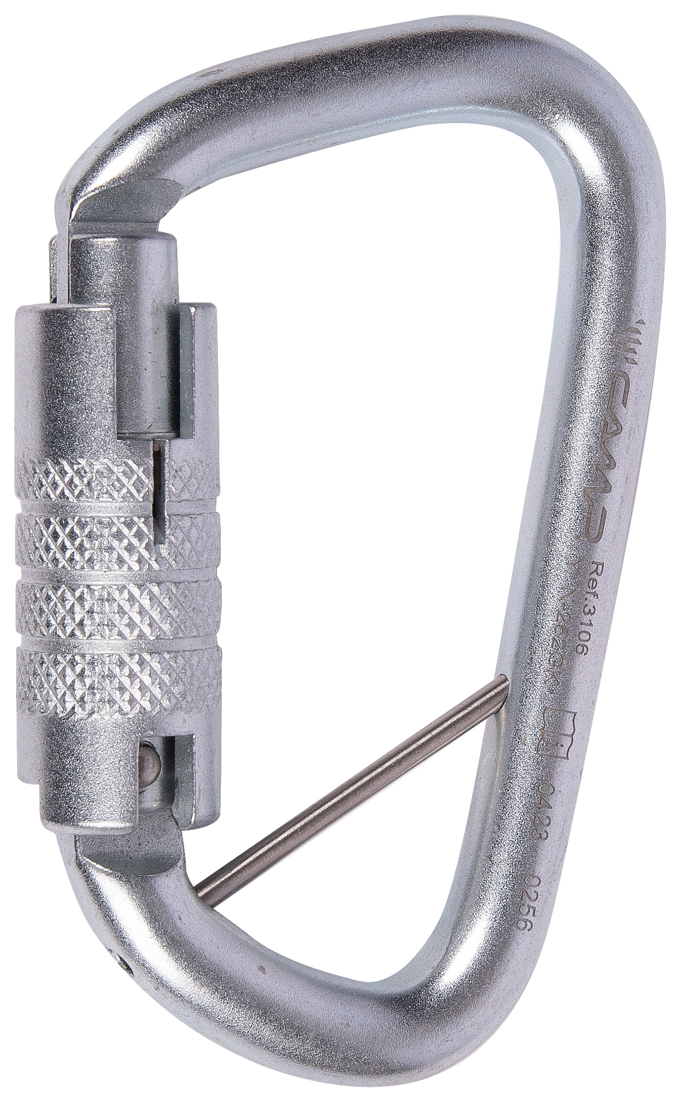 Sehr strapazierfähiger Stahlkarabiner, dessen D-Form besonders für die Auflage von Knoten geeignet ist. Laut den Zertifizierungen ANSI und CSA ist er besonders strapazierfähig, auch bei Schnapperbelastungen bis zu 16 kN / 3600 lbs. Wahlweise mit abnehmbarem Drehschutzstift